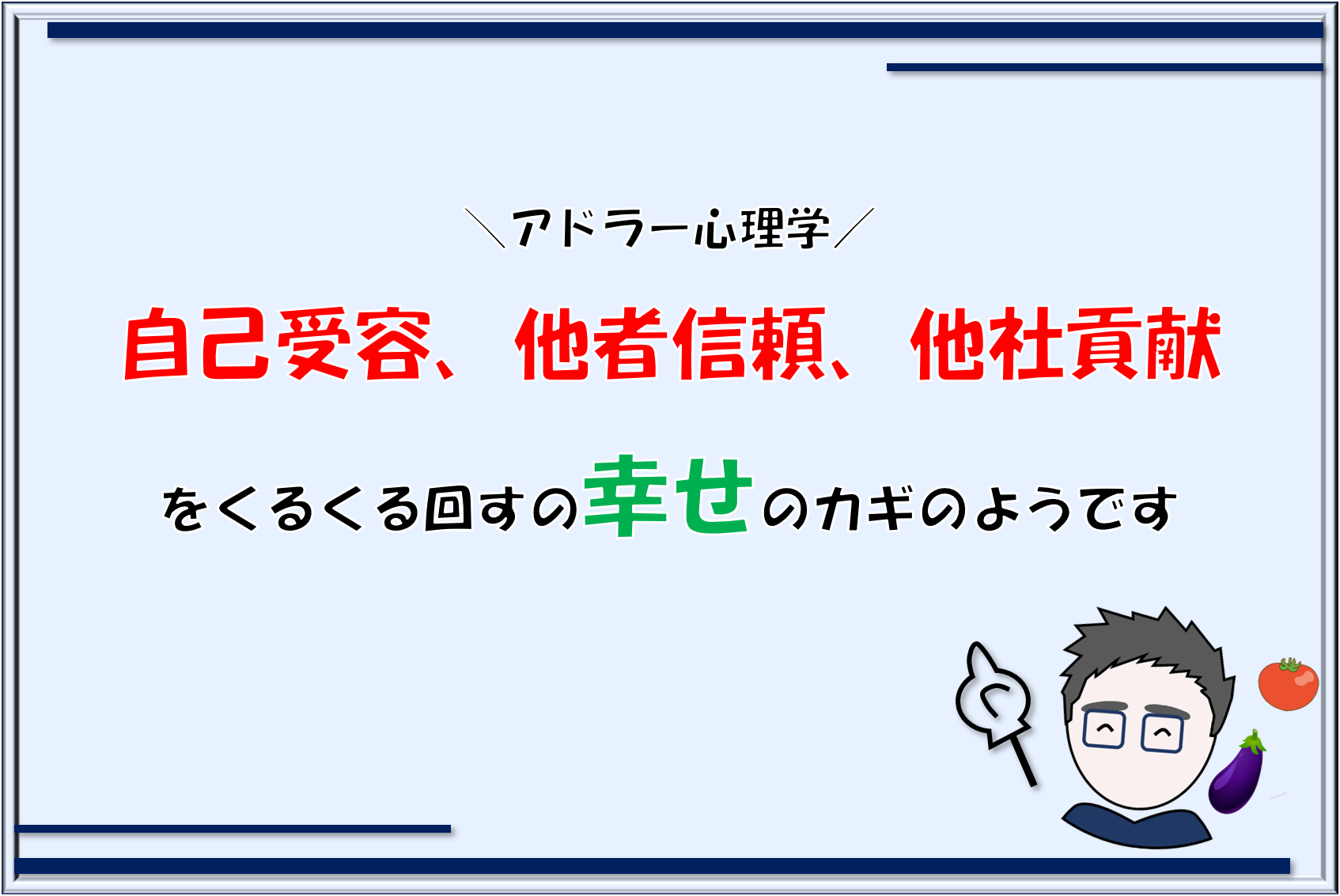 前回の記事で、アドラー心理学の「自己受容」「他者信頼」「他者貢献」について、自分なりの解釈で整理してみました。