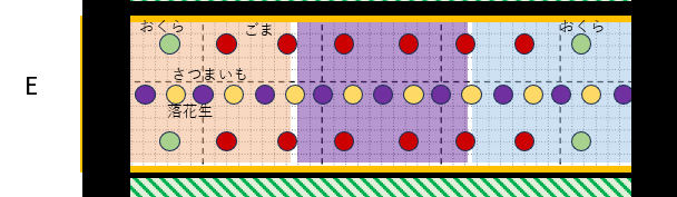 この農園では5m × 9mの区画の中に3つの菌ちゃん畝A~C(1.35m × 4m)と2つの自然農畝D~E(1.2m × 4m)の合計5つの畝をつくりました。