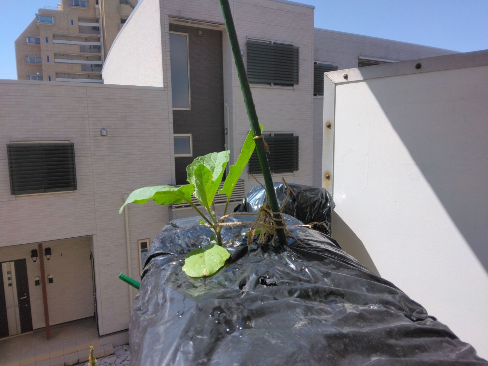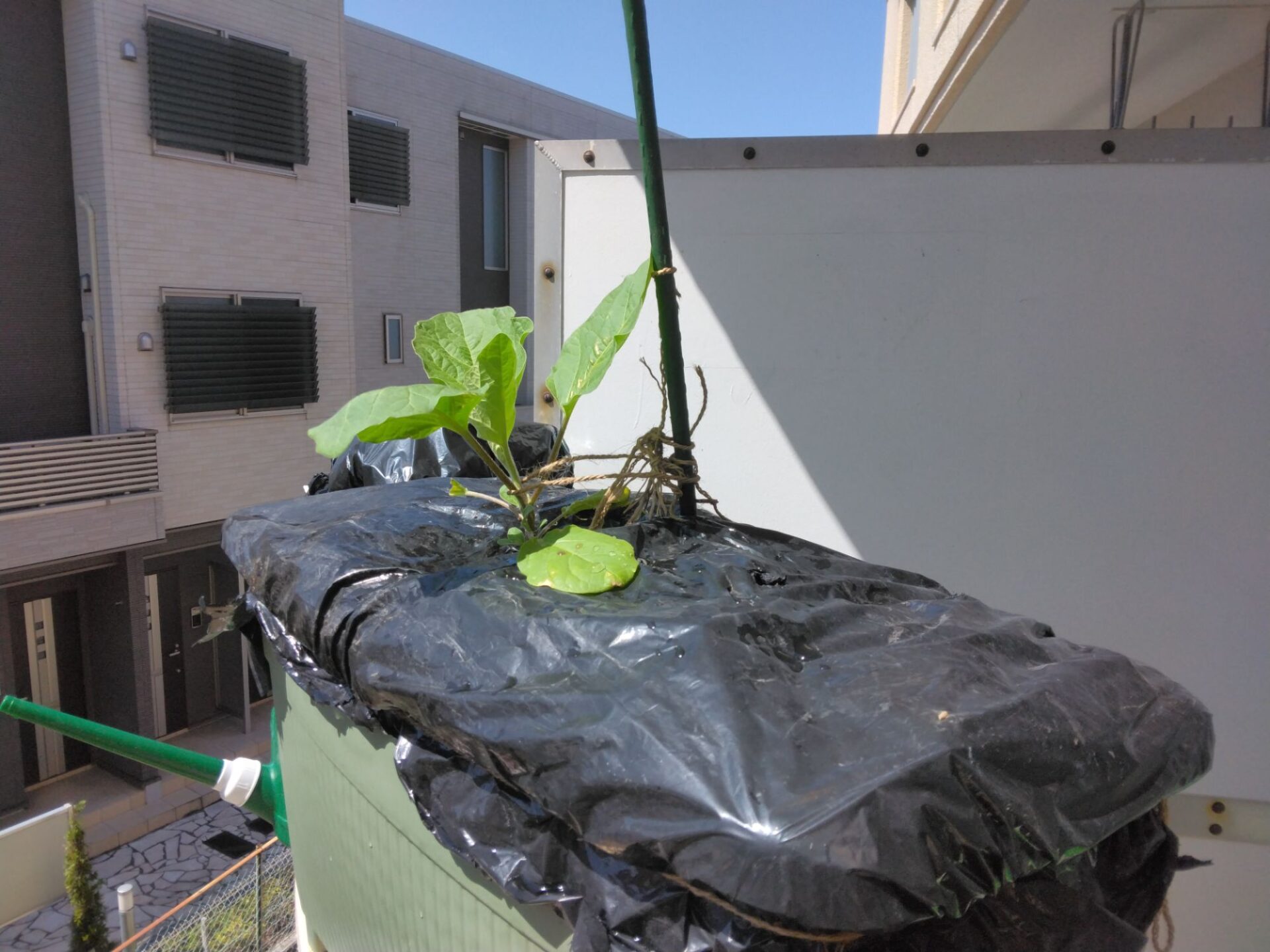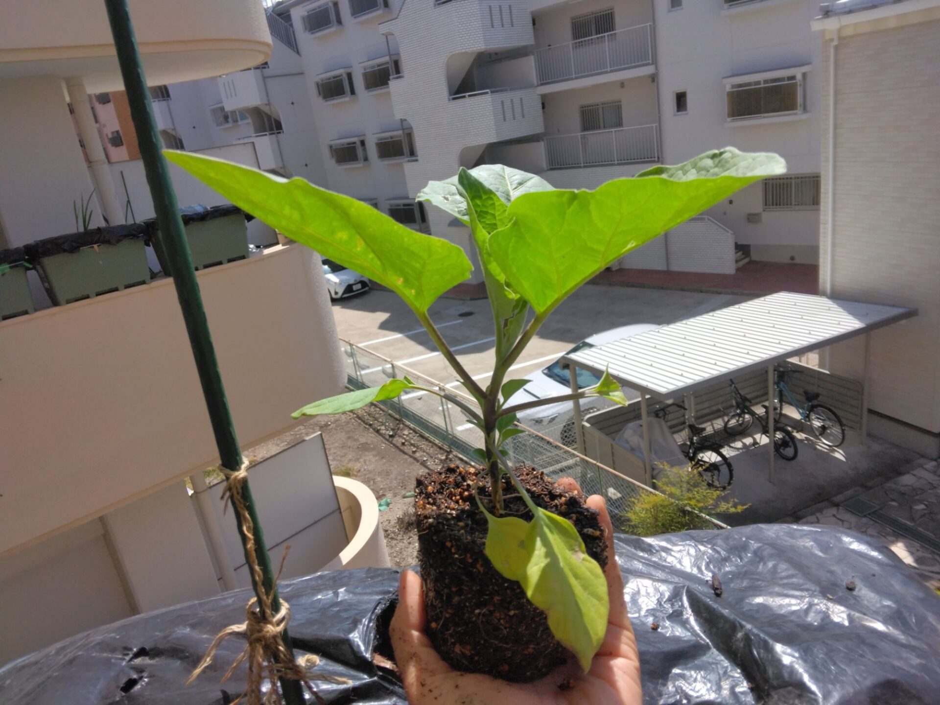 ちょっと老朽化してしまったナスの苗ですが、菌ちゃんプランターの豊かな土の力で、なんとか復活してほしいところです。