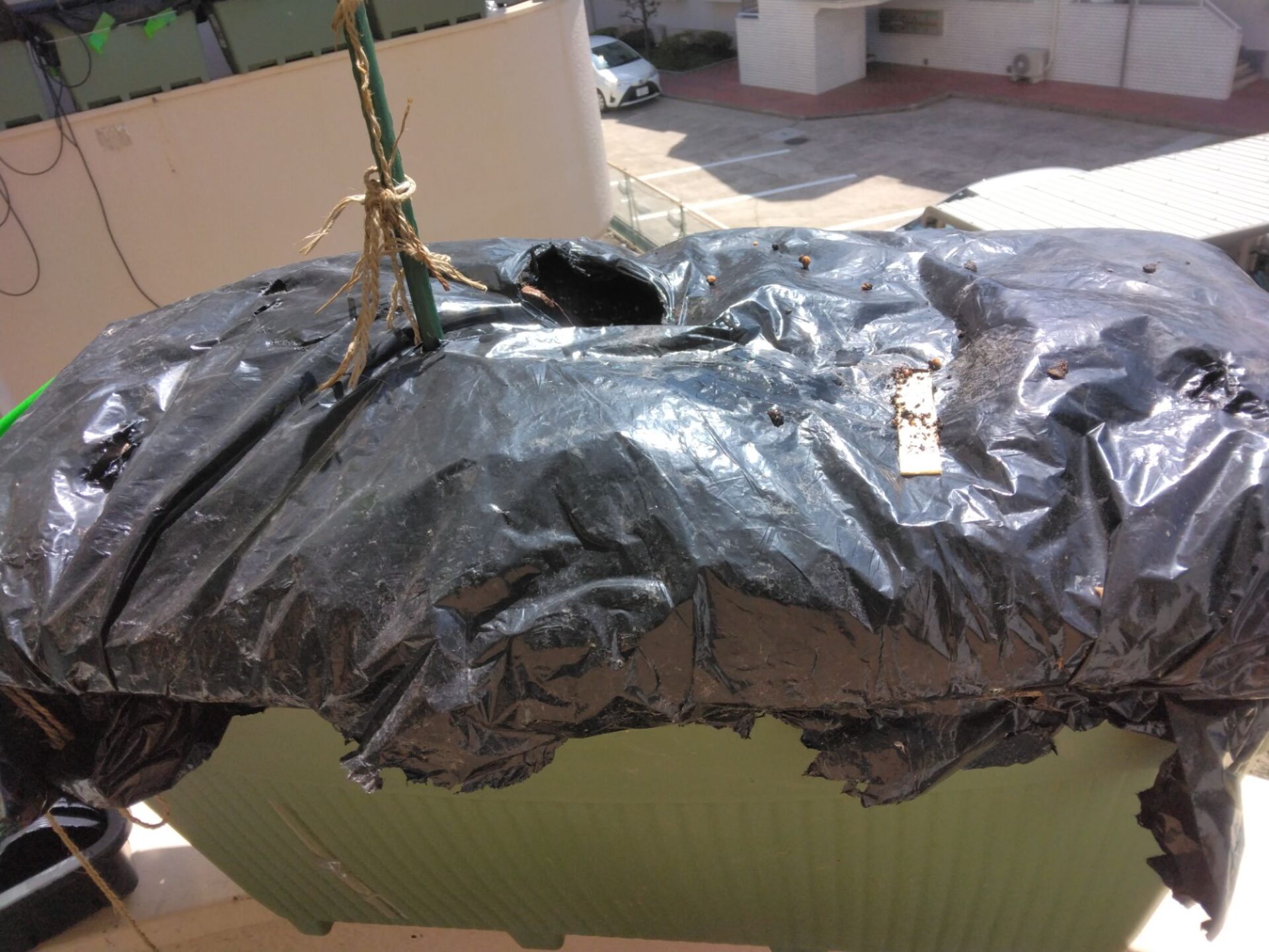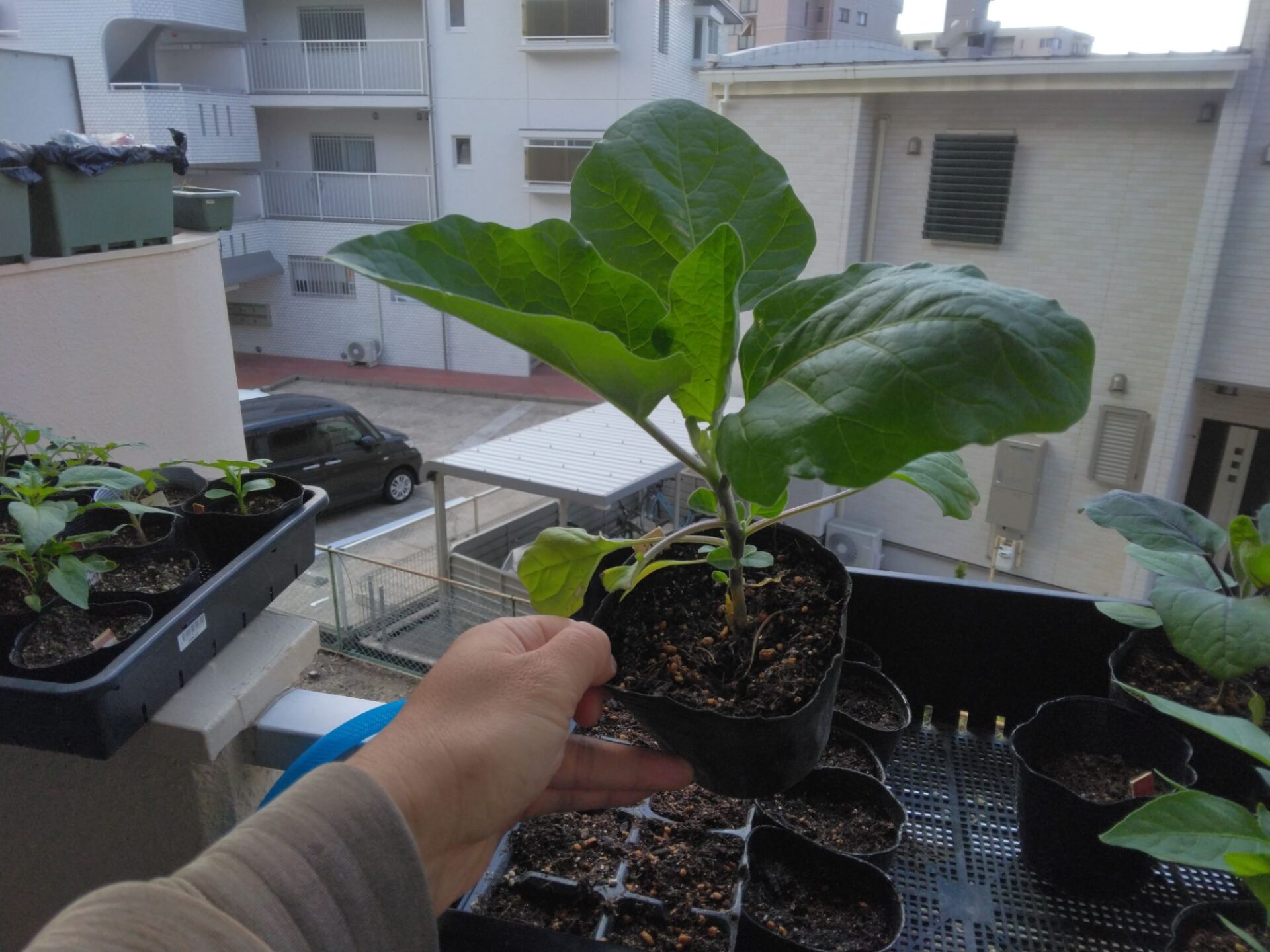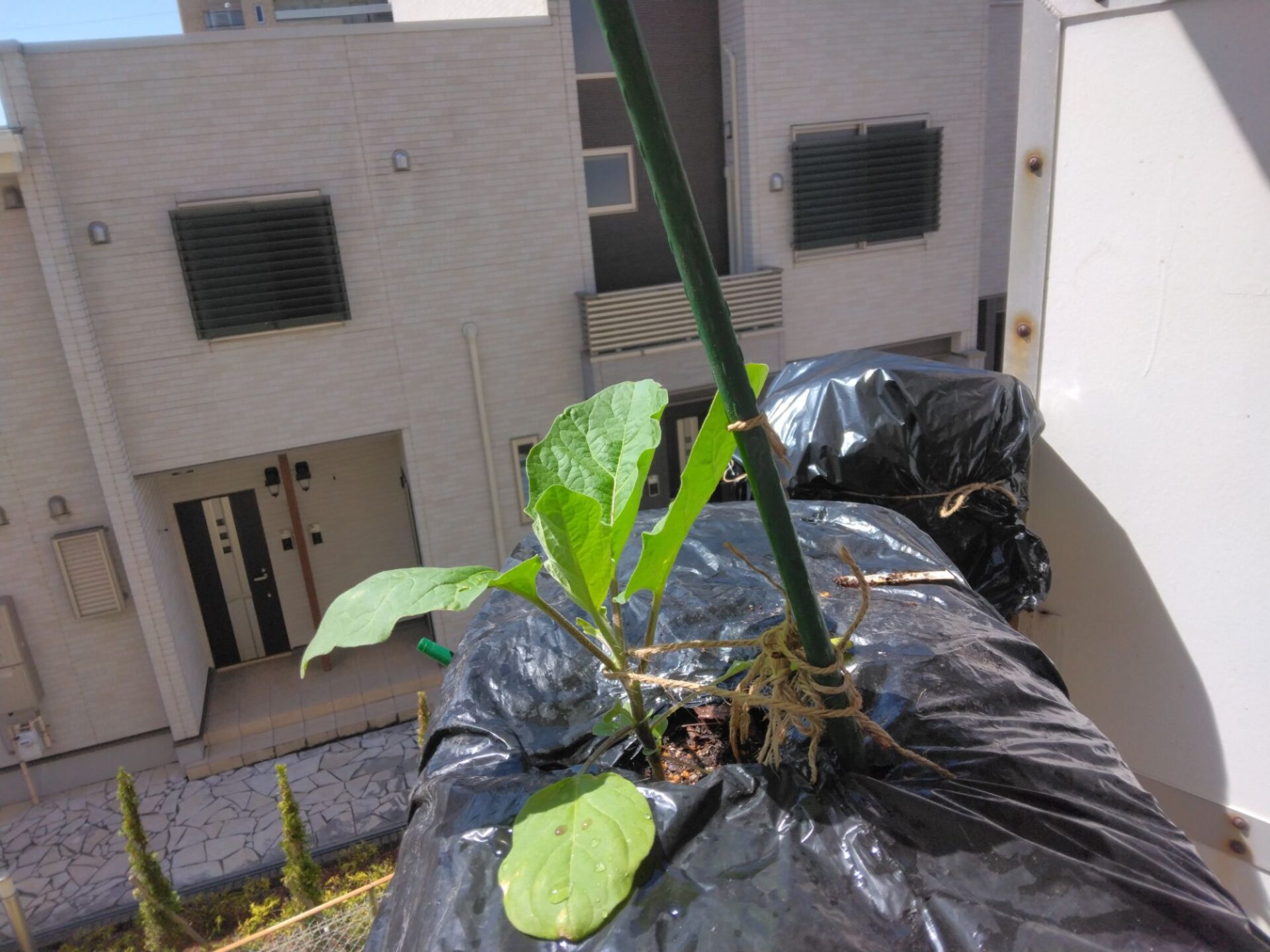 ちょっと老朽化してしまったナスの苗ですが、菌ちゃんプランターの豊かな土の力で、なんとか復活してほしいところです。