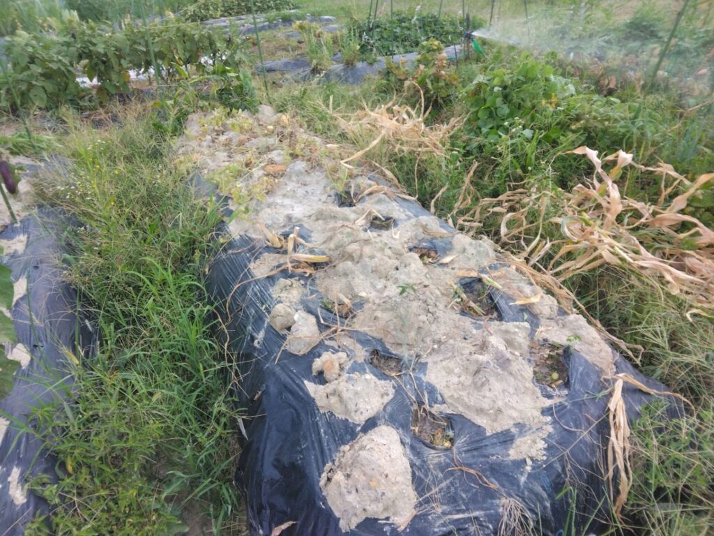 👇とうもろこしを育てていた穴の近くで、新たにマルチに穴を空けて、大根などの種をまきました。