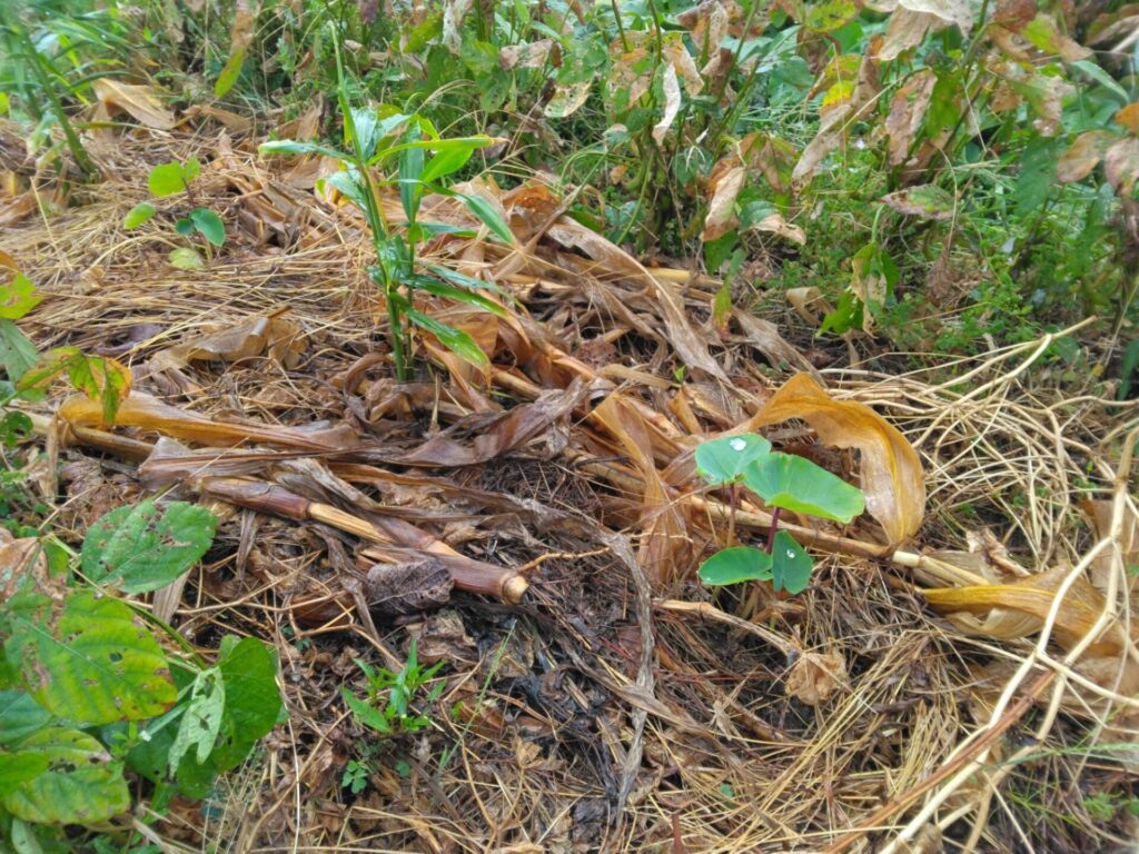 しょうがや里芋の根本付近にとうもろこし株の残渣を置いて草マルチ!