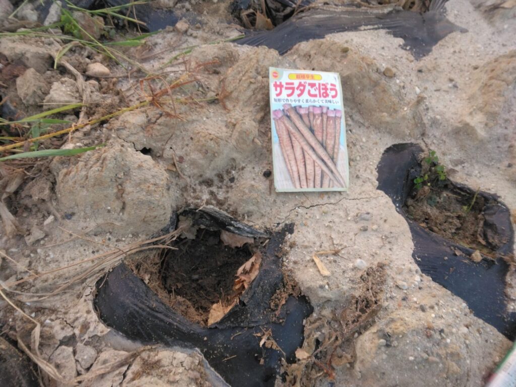 👇は、夏にとうもろこしを栽培していた穴に、根っこを除いた後、大根やごぼうの種をまきました。
