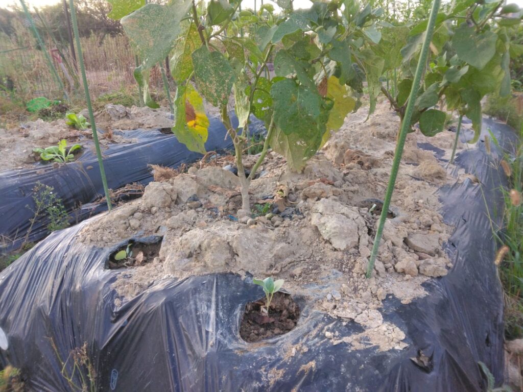 👇まだ栽培中のナスの株と株の間に、新たに植え穴を作り、キャベツの苗を植えつけました!