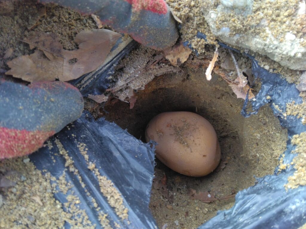 菌ちゃん畝に植え穴を10㎝くらい掘って、そこにじ種イモを入れて土をかぶせる。