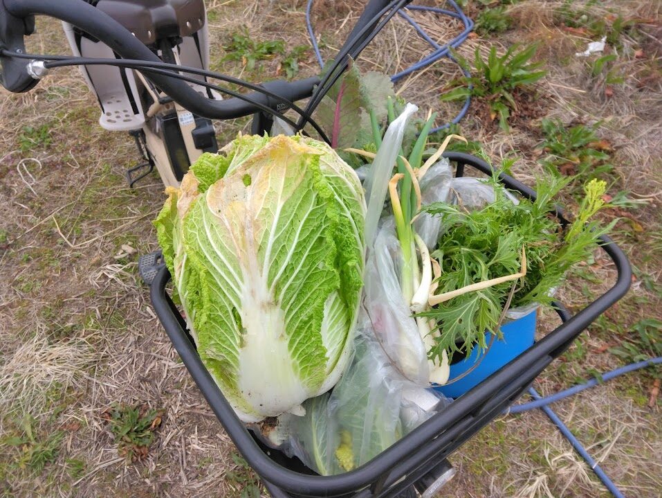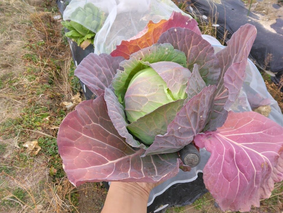 菌ちゃん農法をしている畝に9月に植えていた白菜とキャベツがようやく収穫できました!