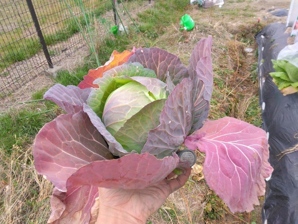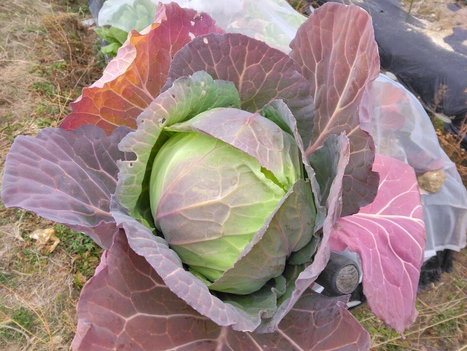 収穫したキャベツについては、生育はやや遅く、葉の裏も紫っぽいですが、葉脈は白色です。