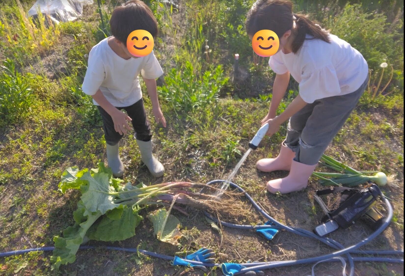 抜けたばかりのごぼうを、弟くんたちが水できれいに洗ってくれました。