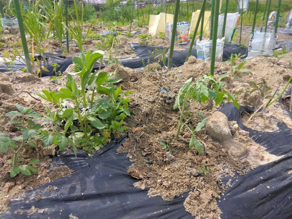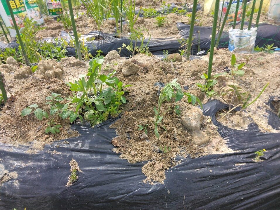 トマトゾーンの一部に春先に植えたソラマメがまだ残ってたんで、ソラマメの間を縫うように植えてやりました。