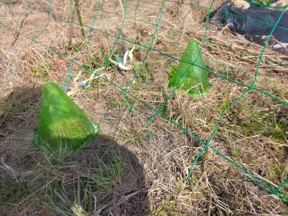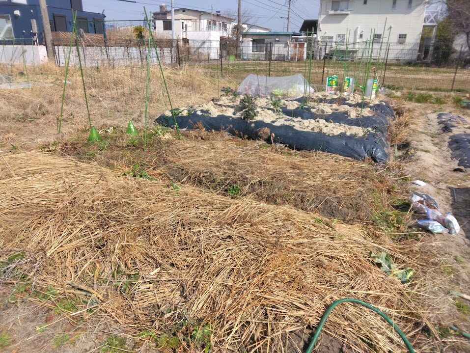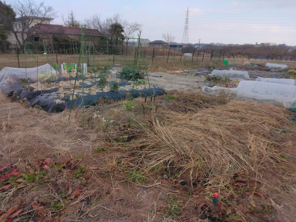 2週間くらい前に、一番手前の自然菜園の畝に枯れ草を敷いてあげました(12月にサツマイモを掘った後、つるだけ敷いて放置でした)。