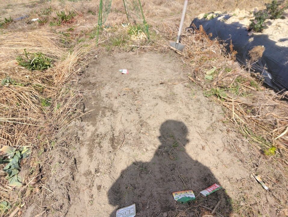 草が結構生えていたので、種まきする周りだけシャベルで根切りしまして、2か所に播種しました。