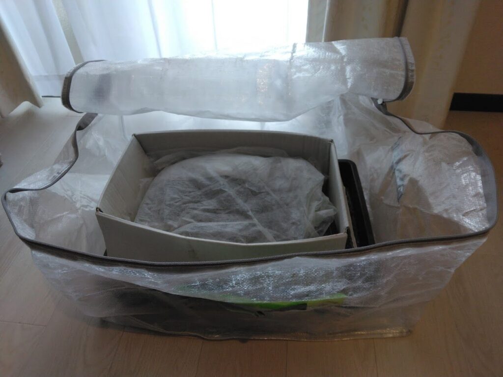 ダイソーで買った(たしか)布団用のビニールケースの中に、セルトレイを入れた段ボールを入れています。