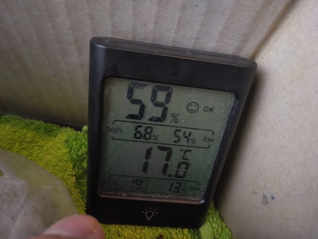 ↓朝、段ボール箱に入れた温湿度計を見ると17℃でした。