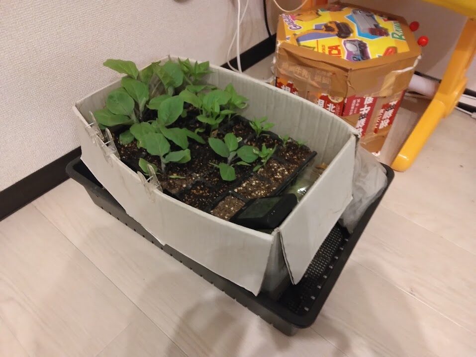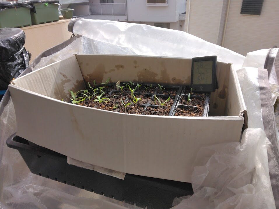 なので僕は、風よけ目的ならばと、苗の背丈が小さい内は段ボールにトレイを入れて管理したりしていました。